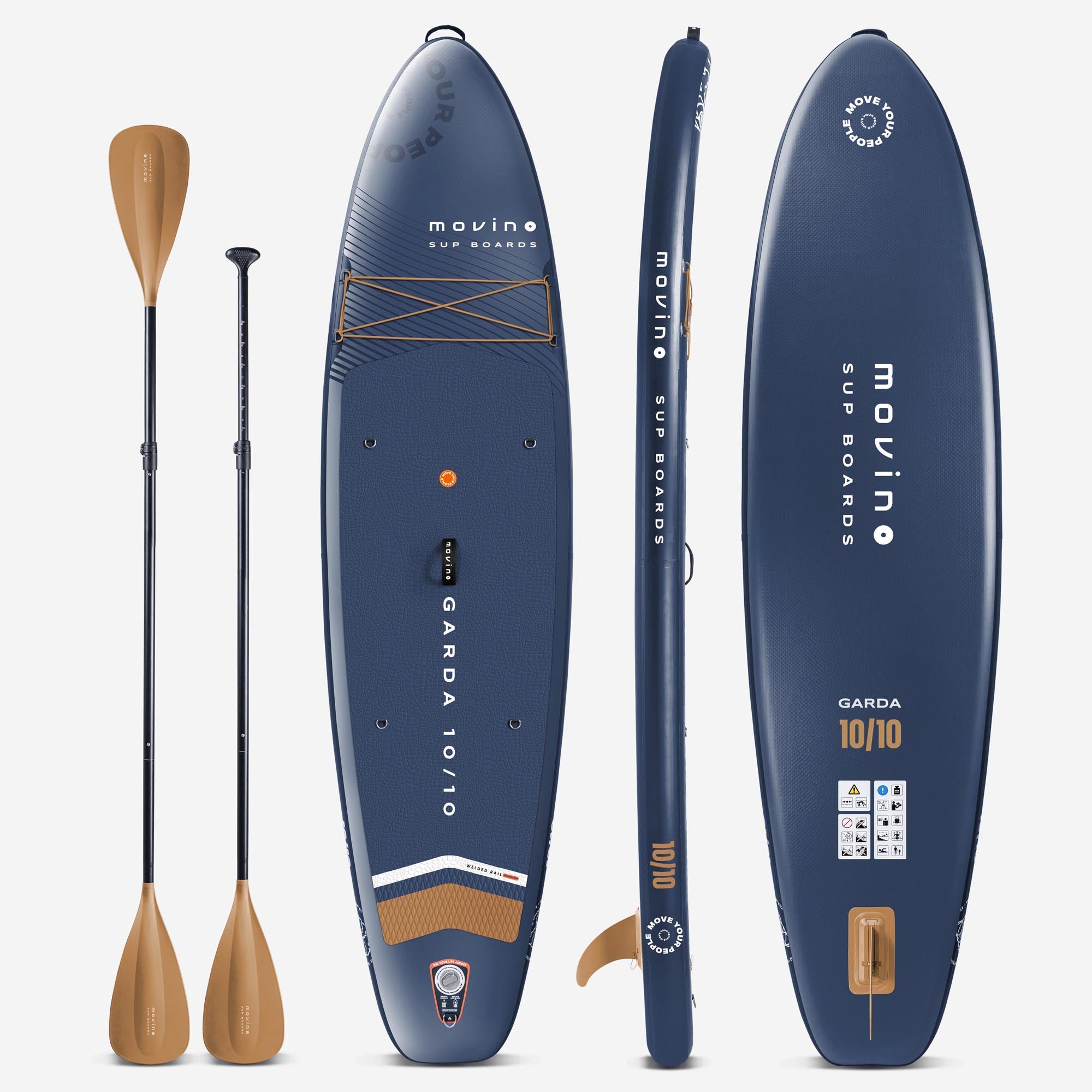 1. Movino Garda board: Dimensions 330 cm x 81 cm x 15 cm, net weight 8 kg, maximum load 150 kg, featuring a kayak seat attachment system.