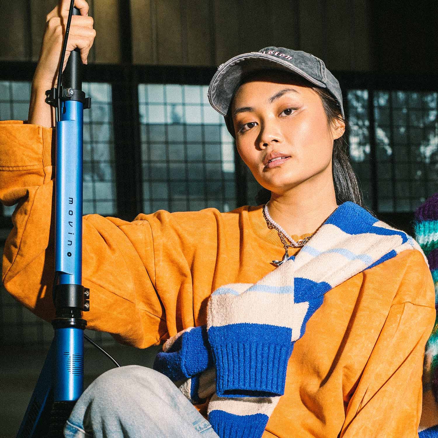 Movino Comfort + este o trotineta urbană elegantă, disponibilă în trei culori metalice neobișnuite și finisaje satinate: roz prăfuit, albastru clasic și verde mentă.