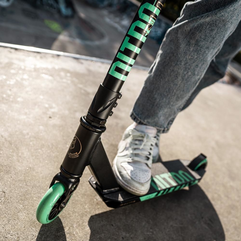 Nitro este pentru riderii curajoși, cu culori îndrăznețe. Roțile din nailon și gripurile se potrivesc cu grafica de pe deck și ghidon. Dacă îți dorești o trotinetă care să te facă remarcat în parc, Nitro este pentru tine – puternică, fără compromisuri, vizibilă de la distanță.