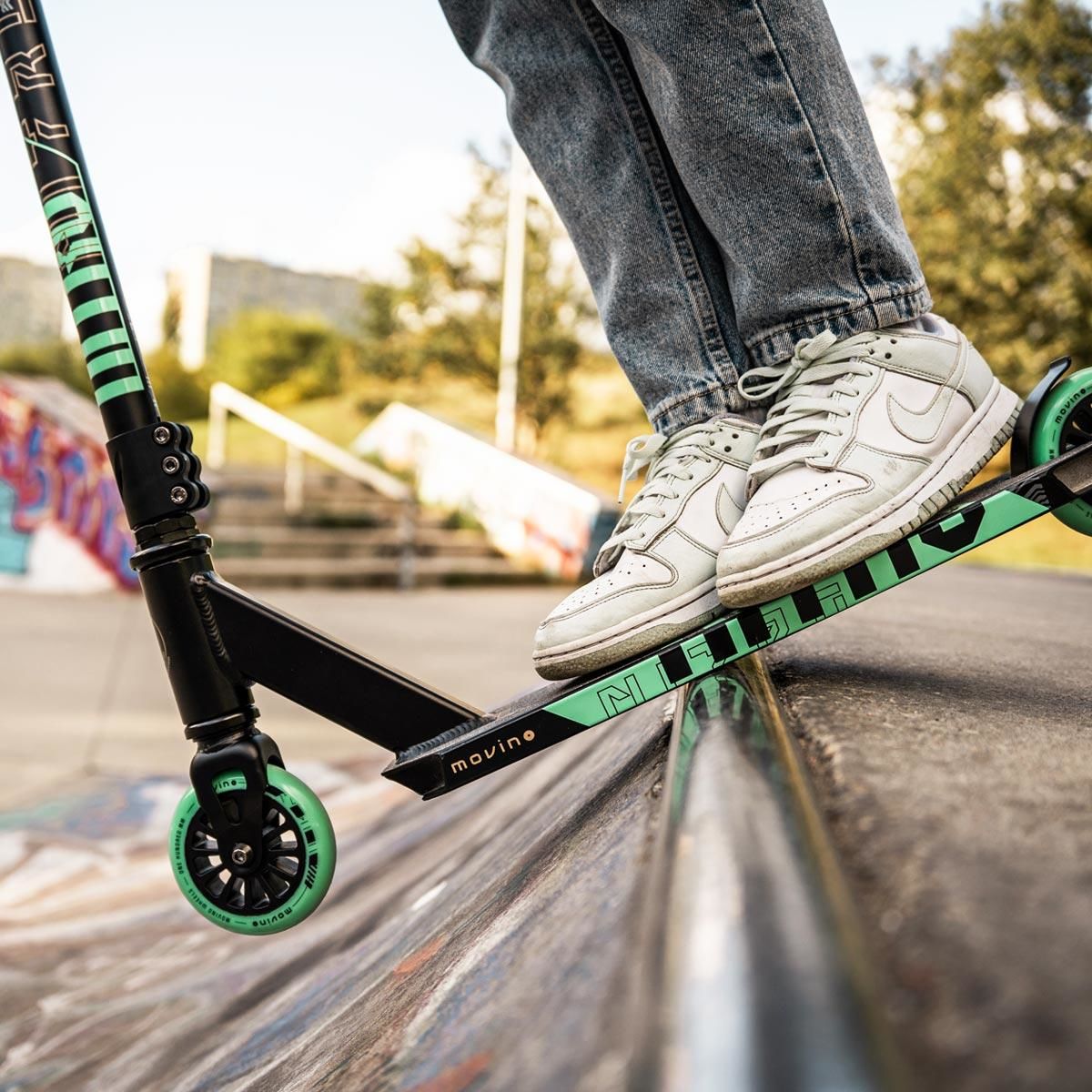 Dacă vrei să începi aventura in skatepark, trebuie să alegi trotineta potrivită. La Movino știm ce să urmărim pentru a crea echipamente pentru rideri începători. Deck-ul ușor și agil oferă suficient spațiu pentru picioare, iar roțile de 100 mm cu rulmenți ABEC 9 se remarcă prin precizie și manevrabilitate.