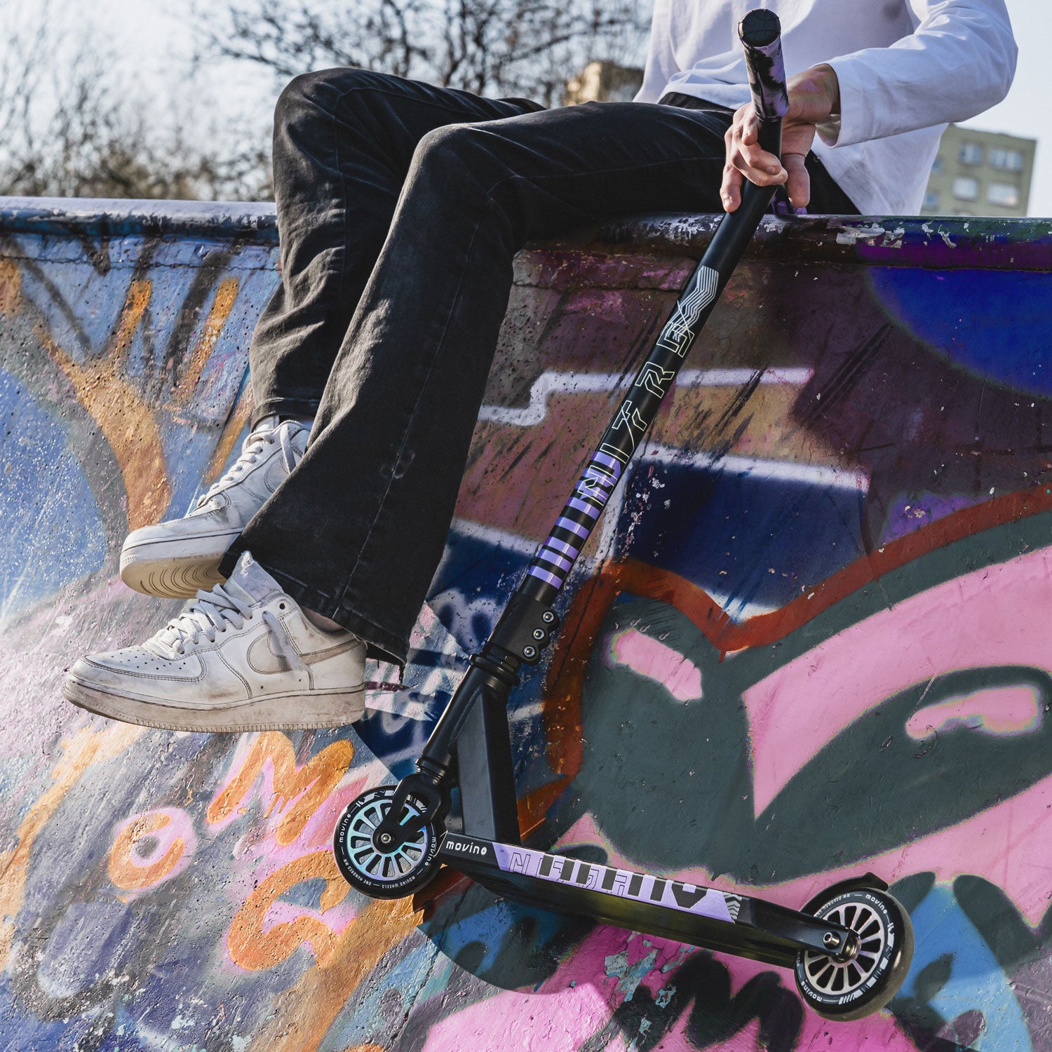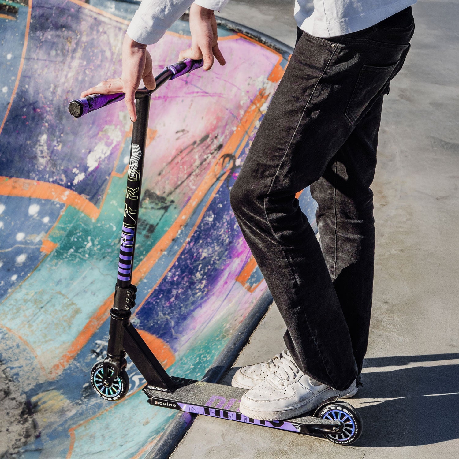 Movino Nitro Purple nu este doar un set perfect optimizat pentru primele salturi în skatepark, ci și un design stilizat al un design stilizat al platformei, mânerului și roților de culoare purpuriu regal. Azi începi lecțiile, mâine vei stăpâni locul!
