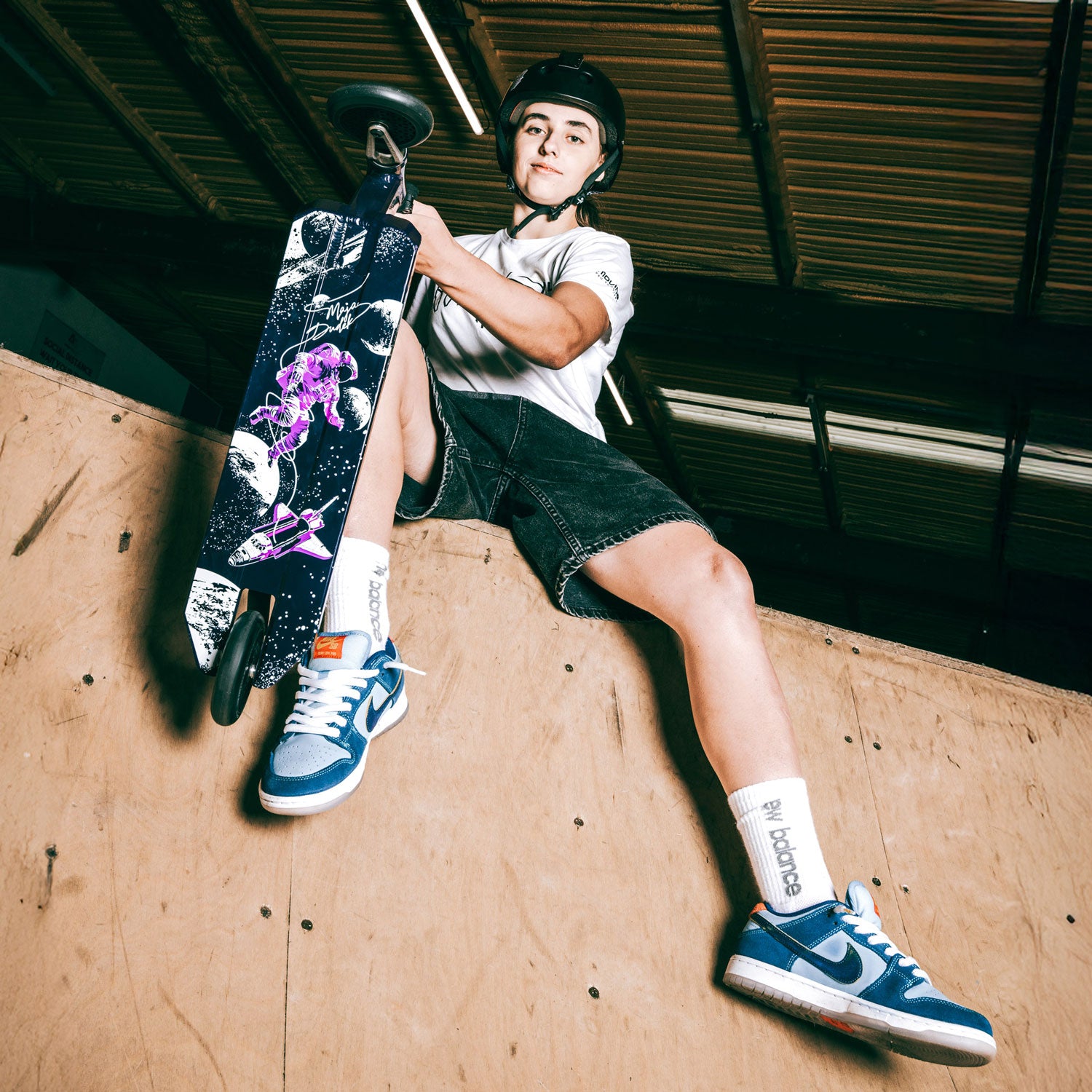 Fiecare detaliu contează în aer, motiv pentru care deck-ul de skatepark al Mayei are dimensiunile alese de ea (48 x 12,7 cm) și o greutate de doar 1,3 kg! Acești parametri îți permit să execuți trick-uri ca și cum ai pluti în aer .